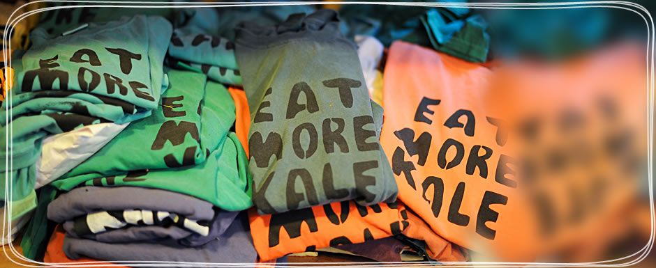 Steven: Along with working on the film, you’ve just launched a new website with sweet new merch like aprons, beanies, even Eat More Kale yoga mats. Also new to Eatmorekale.com is a wholesale section, where you can order larger quantities of shirts or hoodies for entire families of veg-heads or even to sell at a local farmers markets. There’s also a “Design of the Week” now, will these designs be exclusively by you, Bo, or will other local artists be involved?